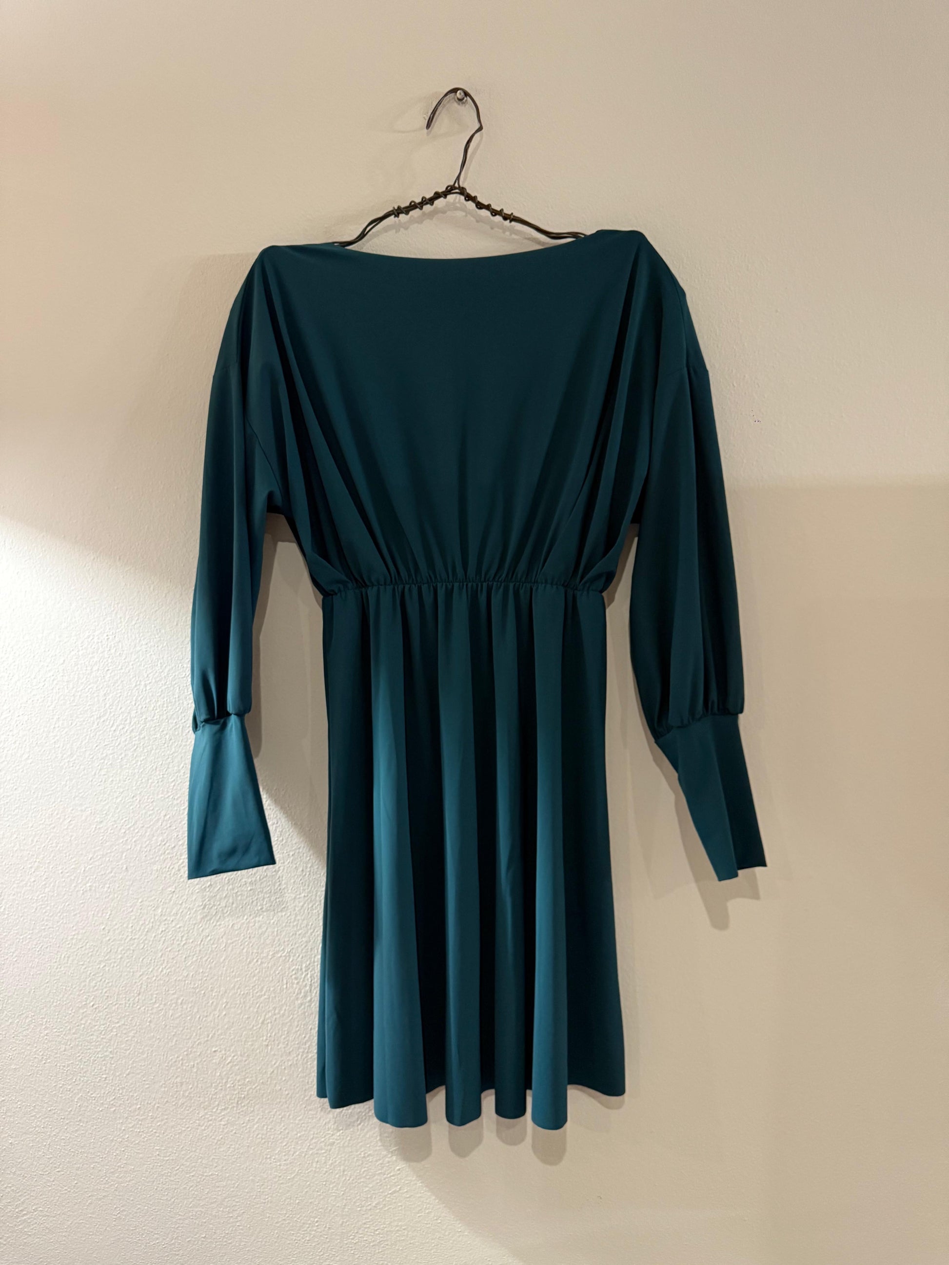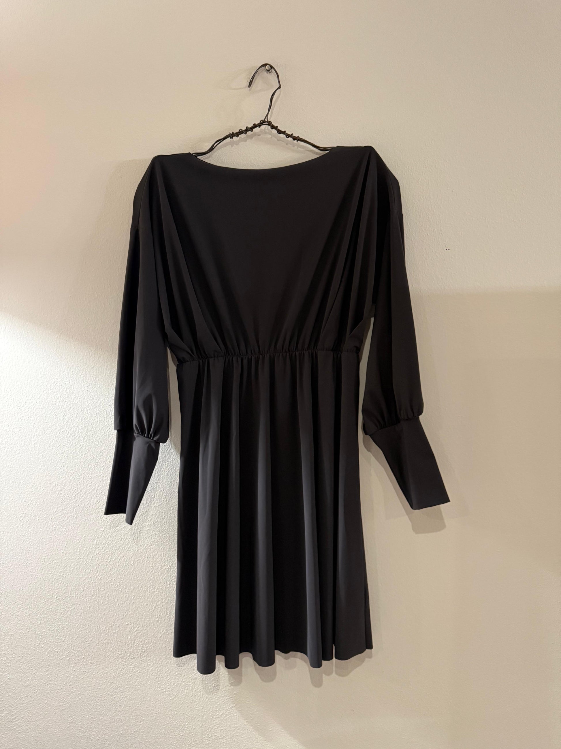 Fresco e versatile, può essere indossato sia come abito che come maglia. La vita elasticizzata valorizza la silhouette con comfort, mentre le maniche ampie con polsino alto aggiungono un tocco chic e contemporaneo, ideale dal giorno alla sera.